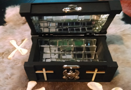 The Mirror Box is designed to work in conjuction with a Doll-baby to reverse an enemy who's jinxing you. It can also be used to punish a wrong-doer in a particularly gruesome manner. Essentially, it turns their own evil words, deeds and thoughts right back against them.