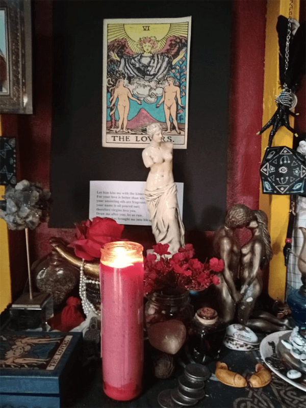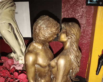 Love can be both life’s greatest blessing and its greatest curse. It is little wonder that love work is by far the most requested service at Divine Harmony Spiritual Church. The Garden of Venus is a section of the main chapel that is dedicated for work attracting lovers, soothing problems in relationships, rekindling passion in relationships that have gone cold, and for reconciliation. This altar calls upon the Goddess Venus to bring her influence into matters of love, beauty, desire, sex, fertility, friendship, sympathy, self-love, increased excellence in artistry, establishing healthy plants, and increasing aesthetic beauty. She is often associated with the Greek goddess Aphrodite and was said to be the loveliest of all deities. A statue of Venus, which Rev. Saint Germain's mother claimed was gifted to her by legendary Knoxville Madame Hazel Davidson, is the centerpoint of the altar. Also included is a very rare bronze statue entitled Lover Prelude by noted Spanish sculptor Manuel Vidal who specialized in erotic imagery, images of Adam & Eve and The Lovers from the Major Arcana tarot, a naturally occuring heart shaped piece of quartz, a box containing matched lode stones for attraction, a large amethyst cluster which is believed to help transform negative energy into a more positive form which is useful to turn around troubled relationships, foster forgiveness, and aid in reconciliation. When you call upon the Goddess Venus, you gain a powerful ally in navigating love's choppy waters.