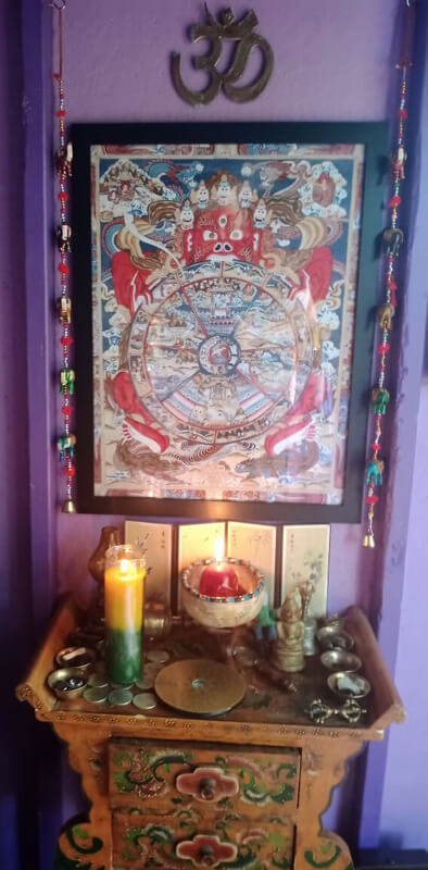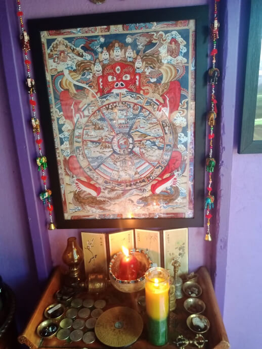 The Shrine of the Compassionate Bodhisattvas is a dedicated altar to call upon these beings of compassion for help with all manner of situations. The shrine is composed of several relics, including a prayer wheel, a kapala which is a holy relic from Tibet made from the brainpan of a human skull, a bell & dorje from Tibet, seven Tibetan offering bowls, a Phra Ngang statue which, according to legend, was blown out of a temple during a time of war, stained with the blood of fallen soldiers, and is possessed by mountain spirits.